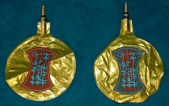 Description: A lot of four metallic gold colored props with matching plastic spigots and Vulcan differing iconographic applications adhered to both the front and reverse sides made for use in the Star Trek: Enterprise episode “Carbon Creek”. When a Vulcan scientific scout vessel crash lands on Earth in Pennsylvania in the year 1957 the crew, including “T'Mir” (Jolene Blalock), are forced to live off of emergency rations for several days before they decide to enter the nearby human town of ‘Carbon Creek’. Two of the items measure approx. 9 inches in diameter, but 12 inches with the spigot and the other pair are smaller with differing applications measuring approx. 7 inches from the spigot to the end or 4.75 inches diameter.