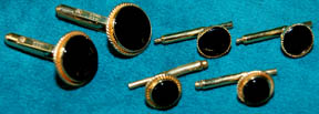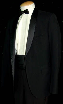 Description: A costume featured in the Star Trek: Deep Space Nine episode “Our Man Bashir”; wherein a transporter accident traps the physical parameters of the senior staff in the main characters from “Dr. Bashir's” (Alexander Siddig) secret agent holosuite program. This costume is for wear by Alexander Siddig in the role the chief medical officer of Deep Space Nine, “Dr. Julian Bashir” in his holosuite program where he played a secret agent of the same name; a full tuxedo consisting of a long-sleeved, white dress shirt featuring vertical pleating and French cuffs, three black bowties, two black cummerbunds; six cuff links all in a gold metal color with black “jewel” in the center. Also included is a black suit jacket featuring silk lapel, three pockets, silk lining and matching trousers with a silk accent down the leg. A sewn in tag reads ‘Deep Space Nine, Alexander Siddig’ and the costumer’s tag reads ‘DS9 282, Bashir, Alexander Siddig’.