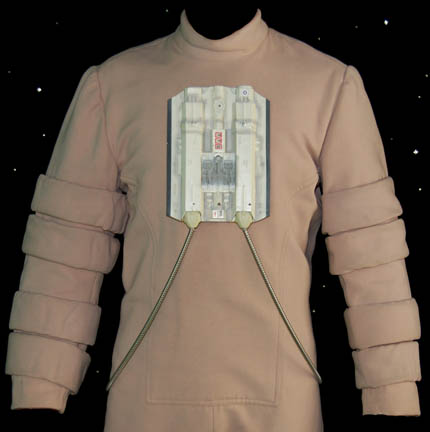 Description: A full length off white uniform jumpsuit featured in Star Trek I: The Motion Picture and appearing in later films like Star Trek III: The Search for Spock. The costume is a jumpsuit with thick bands ribbing the sleeves and legs, with fittings on the chest and back for vacuum formed equipment with molded details to suggest hardware, connected by two lengths of metal wrapped cables on either side. The costume also comes with matching boots.