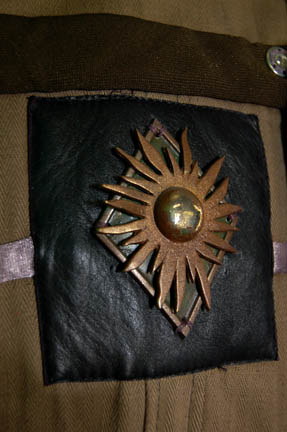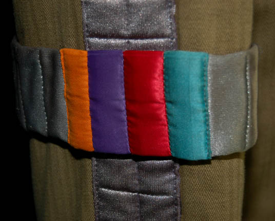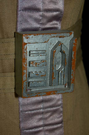 Description: A costume featured in Star Trek IV: The Voyage Home for wear by a member of the Federation Security Council. The costume is an elaborate olive colored jumpsuit with a zip up the center front hidden by a Velcro flap that matches the reflective accents throughout. The costume also features a number of straps and buckles, metal and resin accents to suggest ornamentation and hardware. The costume features a sewn in Western Costume Co. tag.
