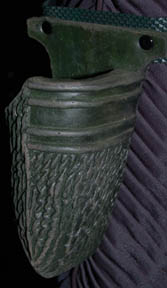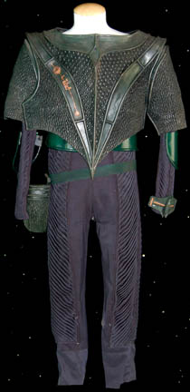 Description: A costume similar to those featured in various episodes of Star Trek: Deep Space Nine for wear by members of Cardassian Military. This costume is a long-sleeved, full-size dark-blue jumpsuit featuring heavy pleating along the arms and legs, buttons and clasps around the chest area, and stirrups for the feet; green plastic arm and rib armor, a plastic belt featuring a black, textured, diamond pattern, a and molded rubber holster with a textured, irregular striping. A black, molded-rubber, armor piece of the Cardassian style, a Velcro'd division strip on the right side, a larger diamond pattern along the chest, the same irregular, striping on the arms and ribs, converging to a point at the waist, and matching molded rubber, knee-high boots. Multiple sewn in tags denote wear by multiple users.