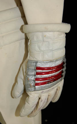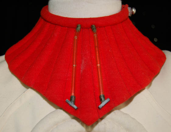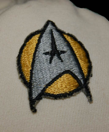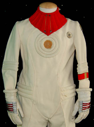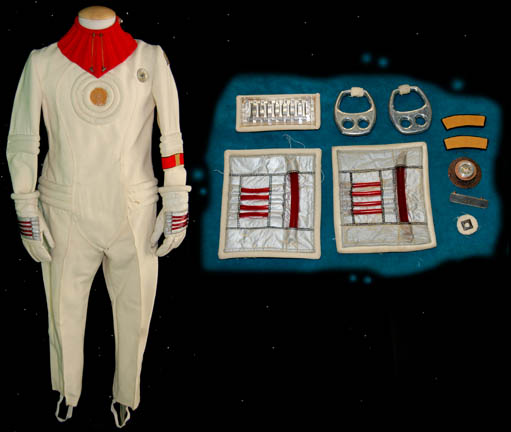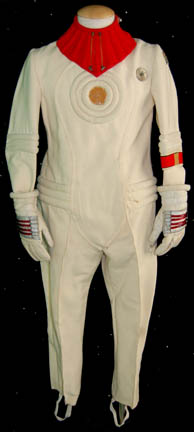 Description: A white Starfleet engineer's radiological suit appearing in Star Trek feature films. The costume is a large white jumpsuit with ribbing on the sleeves and legs with an affixed metal breath mask connection on the left breast and an affixed trainee red division strip in the left sleeve with a yellow engineering intention flash. The costume comes with these uattached elements: a white placement with a silver colored metal badge indicating the wearer to be an ‘able-seaman’, a pair of yellow division strips for the shoulders, a name badge with ‘MARVA’ etched into it, a copper colored foil center chest accent, a red ribbed collar indicating the wearer to be a trainee, a pair of silver colored metal rigging loops, a pair of gloves with red tube ‘thermal’ accents, a pair of ‘thermal’ accents for the thighs and one for the left arm, and a reflective silver accent for the waist. The costume also features a sewn on yellow backed Starfleet logo patch on the left shoulder.