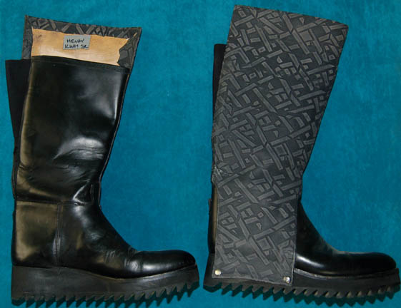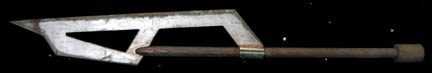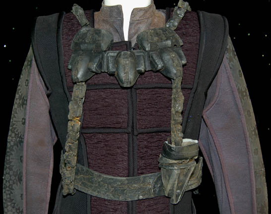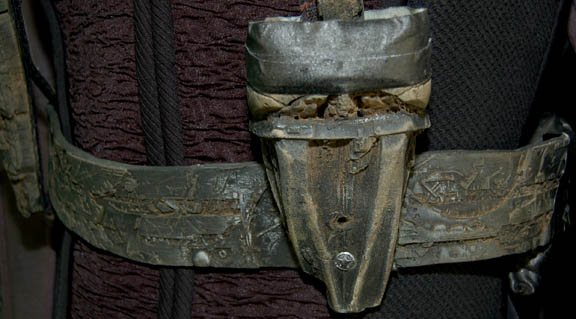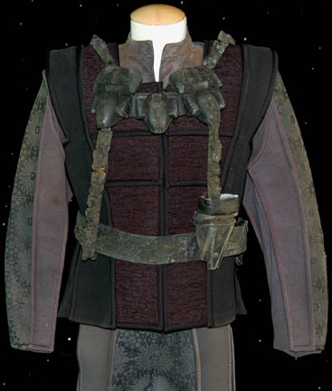 Description: A costume similar to the one of the holographic Jem'Hadar featured in the Star Trek: Voyager episode “Flesh and Blood” and all through Deep Space Nine after contact with the Dominion was established. This costume consists of a sleeveless, full-length, jumpsuit with the top half a black, spandex-like material, the bottom being neoprene over a gray fabric featuring a starburst pattern down the middle and stirrups for the feet. Also included is a vest of further neoprene under sections of black, lattice textured and wrinkled fabric separated into sections by oversized black piping, a distressed jacket matching the lower-half of the jumpsuit, faux suede around the collar, fabric from an extra pocket that has been removed, a wide belt and bandolier featuring intricate rubber and molded foam accents that have started to dry out and crack due to time and storage, multiple loose costume accents with rubber, resin, or metal components and some with Velcro placements, knee-high, black, leather boots in a matching motif with the rest of the costume. With this costume comes the Jem’Hadar melee weapon, a prop Kar’takin, it is a short, wooden pole-arm type weapon with a weighted metal end, the blade is molded plastic on a metal frame; long, vaguely triangular, straight edged to a point and made for stabbing and slashing in battle. Multiple sewn in tags denote use by multiple actors in multiple episodes and shows.