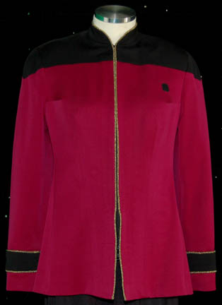 Description: A female Starfleet Admiral uniform comprised of two separate costume pieces. The black dungaree style trousers with red trim on the cuffs were made for wear by “Admiral Gromek” (Georgann Johnson) in the Star Trek: The Next Generation episode “The Emissary”. The accompanying costume tag reads “146, Emissary, Georgann Johnson, 1 TNG, Admiral Gromek”. The Admiral jacket is command red with black shoulders, black bands around the cuffs and gold cord trim. The sewn in costume tag and accompanying costume tag both read “Voyager – Shay Garner”.