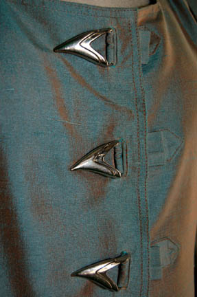 Description: A costume featured in the Star Trek: The Next Generation episode “The Survivors” for wear by “Rishon Uxbridge” (Anne Haney), a woman encountered by the “Enterprise-D” crew with her husband, the sole survivors of a planet ravaged by an alien power, or are they? The costume is teal colored trousers and a cropped sleeved coat with multiple front buckles. The costumer's tag reads ‘151 The Survivors, Rishon, Anne Haney’ and lists the components. The sewn in Deep Space Nine tag indicates further use in other production.