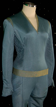 Description: “T'Pol” (Jolene Blalock) was a female Vulcan who served onboard Enterprise NX-01 under Captain Jonathan Archer (Scott Bakkula) during the Star Trek: Enterprise series. This jumpsuit was made for wear by T’Pol during seasons 3 and 4 of the show. It is blue with pleats down each side and the inside of the sleeves with sage green trim around the collar and on the shoulders. A sage green belt is included and two holster variations; one is vacuum formed and covered with corresponding blue fabric, the other is neoprene covered with fabric. There are no sewn in costume tags however the costume tag attached to the item reads, “T’Pol, Jolene Blalock, Blue, 4 jumpsuits, 3 belts, Season 3 & 4”. Please note that although the accompanying costume tag indicates multiple jumpsuits and belts, only one jumpsuit and one belt is in this auction lot.