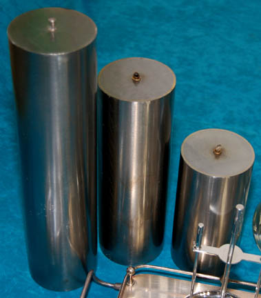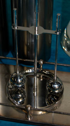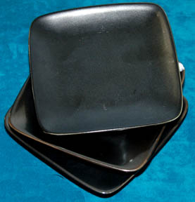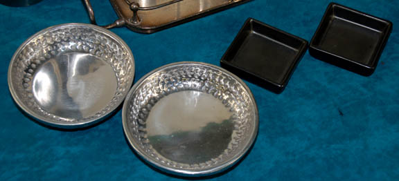 Description: A set of serving dishes and table settings for the captain's mess set on the “Enterprise NX-01” from Star Trek: Enterprise. The set contains a trio of metal oil lamps, cylindrically shaped with holes in the top for one wick each (one measures 6 X 3 inches diameter, the next 9 X 3, the largest 12 X 3), a large glass pouring vessel with a very thick base and a glass topper measuring 12.75 X 7 inches diameter at the base, a trio of square shaped ceramic dished colored gunmetal (5.25 square) with a pair of smaller ones with raised edges (possibly sushi serving plates) measuring 2.5 inches square), a pair of circular aluminum dished with hand pressed divots measuring approx. 4.5 inches diameter, a metallic silver painted napkin ring holder made from wood with five aluminum napkin rings 1.75 inches in diameter, a black metal bake pan with punched out hand grips measuring approx. 1.5 X 12 inches diameter, a pair of silver colored metal serving trays with fastened hand grips and an inset corrugated black rubber no scrape surface inset measuring approx. 13 inches diameter, a trio of salt and pepper shakers, ball holding vessels with stems hanging from a center stand, and finally, a silver serving tray with affixed handles on the long ends with a raised barricade and silversmith markings on the underside as well as etchings measuring approx. 23 X 5 X 1.25 inches.