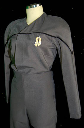 Description: An impressive futuristic gray Starfleet jumpsuit with black trim around the shoulders. There is a zip up the back, an adjustable internal waistband and a small Velcro patch on the left side of the chest for a Combadge to attach. The accompanying Combadge is in the alternate timeline style and made of resin painted gold and silver. This style of costume was featured in episodes that involved alternate timelines such as Star Trek: Voyager, “Endgame”. Costume comes complete with costume tag.