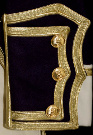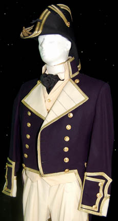 Description: A costume featured in the seventh Star Trek feature film and the only one to have members of the Original series and members of the Next Generation, aptly titled “Generation”; wherein the “Captain Picard” (Patrick Stewart) enlists the help of the long presumed dead “Captain Kirk” (William Shatner) to assist him in stopping a mad man who is destroying whole solar systems for his own selfish ends. This costume is that of an English naval officer circa the late 18th century; a long-sleeved, off-white, button-down shirt with slightly frilly sleeves, a crème-colored vest with gold-colored buttons, and matching overall-style trousers with stirrups for the feet. Also included is navy blue jacket and tails, featuring the same gold-colored buttons with the naval symbol as the vest, gold trim accents, white cuffs and a white open collar; a black tie, a matching black officer's hat with more gold trim and buttons, and black, rubber boots that reach just under the knees. A sewn in tag reads ‘Star Trek VII, Brian Williams’, Brent Spiner’s stunt double, and a costumer’s tag that reads ‘Star Trek VII, Data Stunt, B. Williams’.