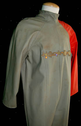 Description: A costume featured in the Star Trek: Voyager episode “Repentance”; wherein “Voyager” encounters a damaged Nygean prison ship and comes to question their idea of justice from meeting some of the prisoners. This costume is the stunt version of the one for wear by the character “Egrid” and is a sage green vinyl jumpsuit with an orange left sleeve and a zip up the back. Across the chest is a geometric rubber panel with built in LED lights of various colors. They are activated by a standard 9volt battery worn on a belt under the suit. Due to time and use, three of the lights appear not to be in working order. A sewn in tag reads ‘Voyager, George Collucci' and the costumer’s tag reads ‘Voyager #259 Repentance, Stunt Egrid, George Collucci’.