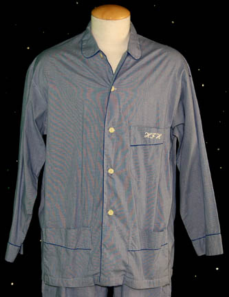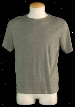 Description: “Captain Archer” (Scott Bakula) huge civilian costume lot made for wear on the Star Trek: Enterprise series. The lot includes gray “Adidas” trousers, a long sleeved gray top and a short sleeved gray “Calvin Klein” V-neck t-shirt. The trousers and long sleeved top have sewn in tags that read “Enterprise, Scott Bakula”. A brown V-neck t-shirt with a sewn in costume tag that reads, “Enterprise, Scott Bakula” and a green ribbed “Kenneth Cole” t-shirt with a sewn in tag that reads, “Scott Bakula”. Blue small checkered pajamas with buttons up the front and an embroidered pocket with the initials “HFH” sewn onto it. The sewn in tag in the pajama trousers reads, “Enterprise, Scott Bakula”. Gray shorts with a sewn in tag that reads, “Enterprise, Scott Bakula” and a navy blue sleeveless “French Connection” t-shirt with a sewn in tag that reads, “Scott Bakula”. A costume from the Star Trek: Enterprise episode, “The Communicator” that includes a brown leather jacket with snaps up the front, a brown waistcoat with a zip up the front and brown trousers. The trousers have circular stitching across the seat, some of which is loose. The sewn in tags in the jacket and waistcoat both read, “Enterprise, Scott Bakula, #34”. “The Communicator” costume comes complete with costume tag that reads, “ENT, The Communicator, #34, Archer”.