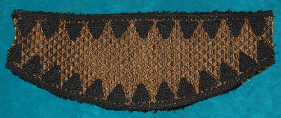 Description: A costume featured in the Star Trek: Deep Space Nine episode “The Nagus”; wherein “Quark” (Armin Shimerman” temporarily becomes the “Grand Nagus” of the Ferengi Alliance. This costume is for wear by Barry Gordon in the role of the Ferengi “Nava”; it is a full-length, sleeveless, brown jumpsuit with stirrups for the feet, a reflective bronze-colored dickie that attaches to the jumpsuit via Velcro. A long-sleeved jacket in a pattern of olive-green and burgundy wavy lines; a multi-colored, striped portion that goes down the front and around the back, features oversized, gold-colored buttons at the neck, more gold trim down the sides, black ribbon appliqué triangles and trim in a zigzag motif, and a Ferengi head wrap the color of the dickie but with the black accents of the jacket. A sewn in tag reads ‘Deep Space Nine, Barry Gordon' and a costumer’s tag reads ‘DS9 #411, Nava, Barry Gordon’.