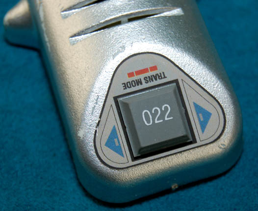 Description: A prop costume accessory featured in the Star Trek: Enterprise episode “Demons” made from molded plastic painted metallic silver with two rubber faux buttons adhered on either end of the front with a graphical application inscribed ‘Trans Mode' around each, and a Velcro placement adhered to the reverse. The item measures approx. 4 X 2 X 1 inches.