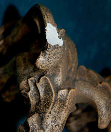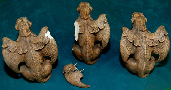 Description: A trio of plaster gargoyles featured in the Star Trek: Enterprise episode “Civilization” appearing in the scene taking place as an “Enterprise” away team enters the shop of an alien in disguise. The gargoyles are painted beige with distress to appear aged and made to have their left wing ‘fixed' as they were being glued back together in the episode. The wings are attached by way of a pair of metal pins within. One of the gargoyle’s wings is actually chipped due to time and storage conditions. The gargoyles are quite fearsome and measure approx. 5 X 5.5 X 4.5 inches.