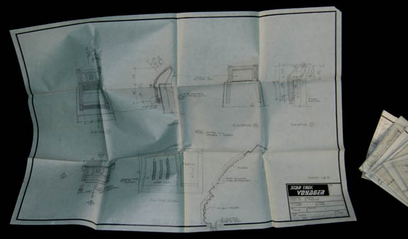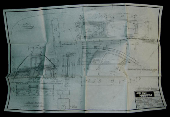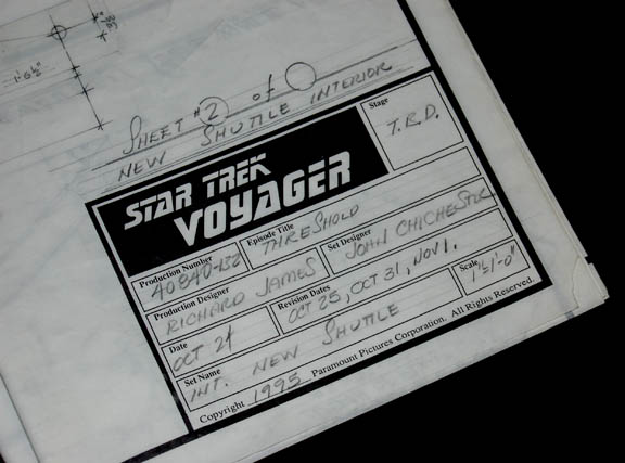 Description: A set of blueprint schematic s used to build the enhanced trans-warp shuttle “Cochran” for the Star Trek: Voyager episode “Threshold”; wherein “Tom Paris” (Robert Duncan McNeill) breaks the trans-warp barrier in an enhanced shuttle but the short flight begins to change and mutate him. This set of blueprints includes exterior and interior schematics and has the show name, stage, production number, episode name, original date, and set name.