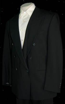 Description: A black tuxedo from the “Wrof” collection with sewn in Deep Space Nine tags reading ‘Michael Dorn' and a costumer’s tag reading ‘Warf’. The costume is black trousers with a matching tuxedo jacket and a pair of white tuxedo shirts with pleated fronts and sewn in Deep Space Nine tags reading ‘Michael Dorn’. Another costumer’s tag reads ‘DS9 #484 “Our Man Bashir”, Worf, Michael Dorn’ and lists the components.