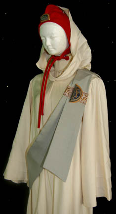 Description: The Vulcans are a humanoid race from the plant Vulcan who are known for their great sense of logic and stoic nature. They were one of the instrumental species responsible for establishing the United Federation of Planets and were featured throughout the Star Trek anthology. This Vulcan costume is believed to have been used by a background actor during the final scenes of Star Trek III: Search for Spock in which “Spock's” (Leonard Nimoy) soul was restored to him after a successful mind meld with “Dr. McCoy” (DeForest Kelley). The cream robe has layered sleeves, a hood and a zip up the back. Worn over the top is a gray sash with a band with woven symbols and a sewn on half-moon resin decoration. The decoration is blue with gold trim and a gold Vulcan symbol painted on it. Accompanying the robe is a rust color skull cap with holes for the ears to protrude through, a circular resin decoration on the front, a pointed fin running from the front of the cap to the back and a chin tie.