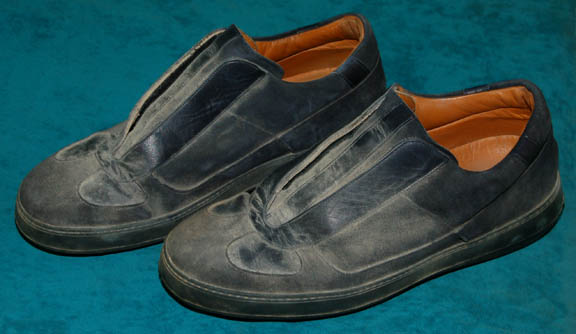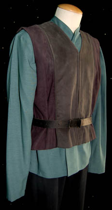 Description: A costume made for wear in the ninth Star Trek feature film “Insurrection”; wherein “Captain Picard” and the crew of the “Enterprise-E” rebel against Starfleet and the Federation to prevent the exploitation of a defenseless race called the Ba'ku. This costume was made for wear by Brent Spiner in the role of the android second officer of the “Enterprise-E”, Lieutenant Commander Data”; it i and consists of a long-sleeved, light-blue, tunic featuring an open-neck collar, dark-blue, overall-style trousers with stirrups for the feet, and a black, leather belt. A dark and light blue, two-toned, suede vest and matching slip on shoes, both with dust and dirt remaining from production. All items were found in the Brent Spiner section, a sewn in “Muto Little” tag reads merely “Data”, and the costumer’s tag reads ‘Data, Change #3, sc-205 268, Cave in (dirty)’.