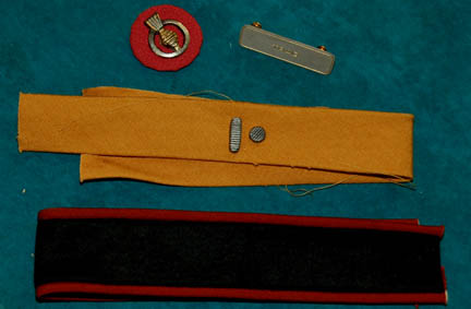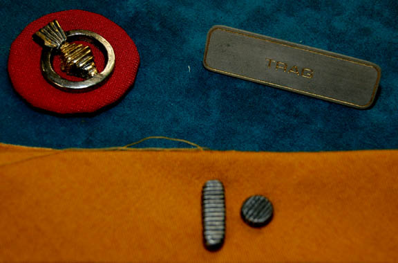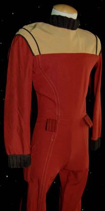 Description: A crewman's uniform of the style appearing in various Star Trek feature films. The costume is a red jumpsuit with black accents and a tan yoke. The costume features an unattached red trimmed black felt placement for an accompanying gold colored band with an affixed silver colored metal commendation bar and ‘5 year service’ pin and a black ribbed collar and cuffs, a red placement with an attached gold and silver colored metal ‘master chief petty officer’ rank badge, and a name badge with ‘TRAG’ etched into it. The collar of the uniform is damaged due to time or storage conditions.