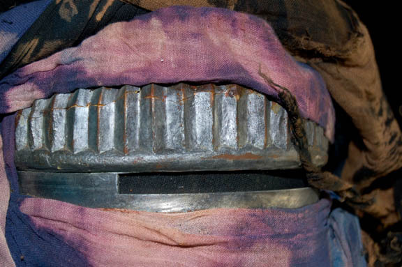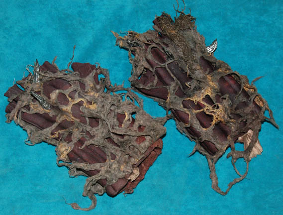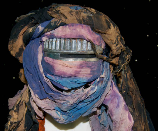 Description: A costume featured in the second Star Trek feature film, “The Wrath of Kahn”; wherein “Khan Noonien Singh” (Ricardo Montalban) escapes exile and attempts to exact his revenge on “Admiral Kirk” (William Shatner). This costume is for wear by Judson Scott in the role of “Joachim”, one of the augmented humans from the 20th century that had vowed his loyalty to “Kahn”; it consists of three yellow trousers featuring string tied down the sides. A quilted, orange vest featuring the remnants of brown, short sleeves, brown gloves with shreds of fabric glued to them, hiking boots covered in yellow fabric making them reach just under the knee, strings like on the trousers, and a long strip of fabric to tie around the top; two necklaces of faux suede with random wires and pieces of circuitry arranged like they were jewelry, and a resin faceplate featuring a thin strip to see out of and covered with enough multi-colored fabric shreds to enshroud and protect the head from the savage environment of Seti Alpha V. items and extremely distressed in the form of rips, tears and stains all over and feature tags that denote use by Judson Scott.