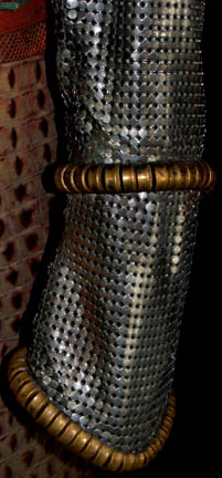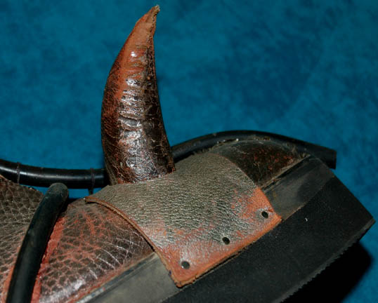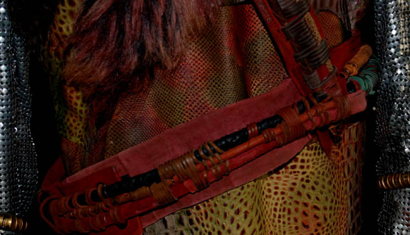 Description: “Klaang” (Tiny Lister) was the first Klingon ever encountered by Humans and featured in the Star Trek: Enterprise pilot episode, “Broken Bow”. This costume was made for wear by Klaang in that episode but it was later modified to it's current appearance for wear by “General K’Vagh” (James Avery) in the Star Trek: Enterprise episode, “Divergence”. The costume includes a multicolored lizard skin print leather top with faux fur shoulders and chain-mail sleeves. Gold colored metal bands are around the cuffs and forearms. The sewn in tags read, “Enterprise – Tiny Lister” and “Enterprise – Tiny Lister, Troy Brenna #80, James Avery #91”. The harness is made of leather and suede with gold colored metal accents. The trousers are brown with pleats down the front and back of each leg. The sewn in tag on the trousers does not list Tiny Lister but it lists James Avery and three other background actors. Also included are Klaang’s / K’Vagh’s boots that are made of brown leather with leather accents and faux spikes. The tags in each boot read, “Tiny Lister” and “James Avery”. Costume comes complete with costume tag that reads, ““Enterprise, Klingon – Tiny Lister” and “Enterprise – Tiny Lister, Troy Brenna #80, James Avery #91”.