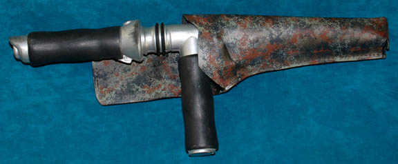 Description: The M.A.C.O – Military Assault Command Operations - is an elite Terran military command from Star Trek: Enterprise. They were assigned to the Enterprise NX-01 under the command of Captain Archer at the end of season 2 to assist in military functions. This item is a prop version of one of their stun batons in its holster; it is rubber cast, simulated metal with black rubber pads on the two handgrips, textured black stripes around the shaft, narrowing to a black, rubber nodule and including a vinyl holster with a hoop to attach to a belt and painted in what Is called “urban camouflage” as are all M.A.C.O. accoutrements. The item measures approx. 17 X 6.5 X 2.5 inches.