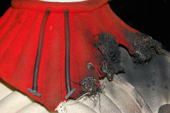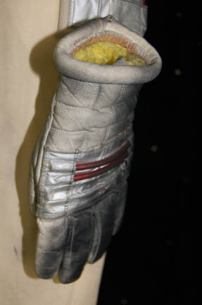 Description: An Starfleet engineer's white radiological suit appearing in various Star Trek feature films like Star Trek II: The Wrath of Khan or Star Trek VI: The Undiscovered Country. The costume is a jumpsuit with ribbed accents around the waist, elbows and on the chest. The costume comes with these attached elements, a pair of engineering yellow division strips on the shoulders, a pair of silver colored metal rigging loops on the waist, a copper colored foil center chest accent, a silver colored metal breath mask connection on the left breast, a pair of opposing red tube ‘thermal’ accents on the thighs and one on the left sleeve, and a one reflective silver colored accent on the waist; and as for the left sleeve a trainee red division strip with a gold intention flash and a white placement with e silver colored metal badge indicating the wearer to be an ‘able-seaman’. The costume also features these unattached elements: a red ribbed collar indicating the wearer to be a trainee, a silver colored name badge reading ‘KRIM’, and a pair of gloves with red tubing ‘thermal’ accents on the outside. The costume is heavily distressed to depict the danger of battle. The costume features holes in the right knee, and general blackening to depict’ scorching’, many of the attached elements are also ‘scorched’, the absence of a Starfleet emblem patch on the left shoulder is apparent due to an outlining of scorching and remaining threads.