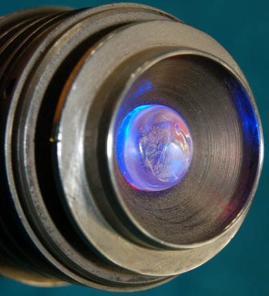 Description: An electronic device made for use on Star Trek episodic television. The cylinder is made of metal with grooves around its circumference and applications for detail. A button on the bottom activates twinkling magenta and blue lights at the tip and through the holes around the top. It is powered by a standard 9Volt battery (not included). Measures approx. 5 x 2 ¼ inches.