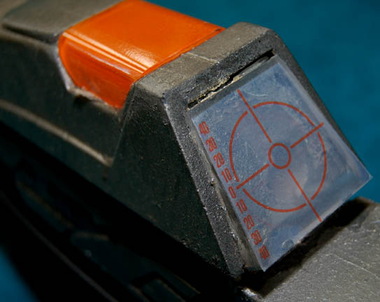 Description: A prop weapon similar to those featured in and after Star Trek: First Contact. This item is rubber cast in gray featuring black accents, a black, textured barrel, scope placement with a graphical application upon it and orange plastic accent, two faux buttons behind the scope, attached stock, and black, nylon strap. The item measures approx. 33 X 8 X 3 inches.