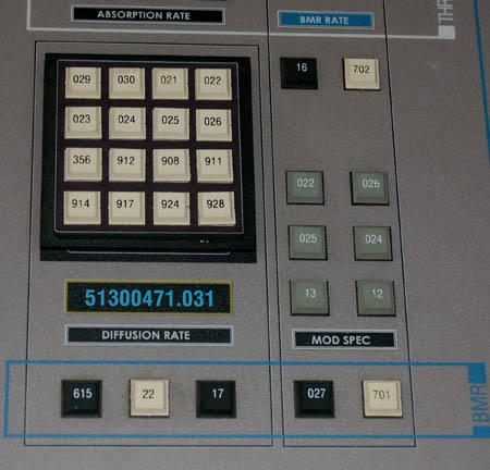 Description: A piece of set dressing featured in the Star Trek: Enterprise episode “Vanishing Point”; wherein a transporter accident has “Ensign Sato” (Linda Park) believing that she is becoming invisible to the crew. This item is an irregularly-shaped piece of smoked acrylic with a gray, graphical application of an instrument panel featuring three main areas: “Threshold Levels”, which has several faux buttons with numbers on them, labeled “Absorption Rate” and “BMR Rate”; “BMR”, which has only a few buttons but between the two is a whole bank of more faux buttons labeled “Diffusion Rate” and “Mod Spec”. A third area labeled “Respiratory Monitor” dominates the whole right half of the panel and features a vertical, numbered gauge, three rubber-backed, faux buttons along a faux slider labeled “Axis”, one button off by itself that reads “Intrinsic Factor” above it, and screw holes on each corner where it was bolted to a wall. The item measures approx. 14.5 X 21 inches and is of negligible height.