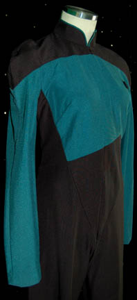 Description: A Star Trek: The Next Generation female Sciences blue Starfleet uniform made for wear during the series and/or ‘The Next Generation' movies. The jumpsuit is black with Sciences blue sleeves and upper torso. There is blue trim around the collar, a small Velcro patch on the left breast for a Combadge (not included) to attach and a zip up the front. Costume comes with costume tag.