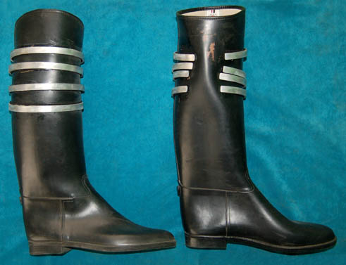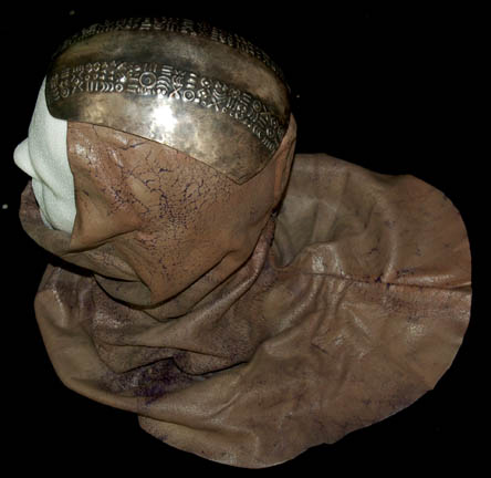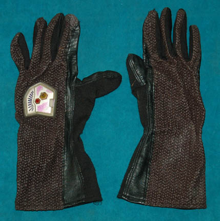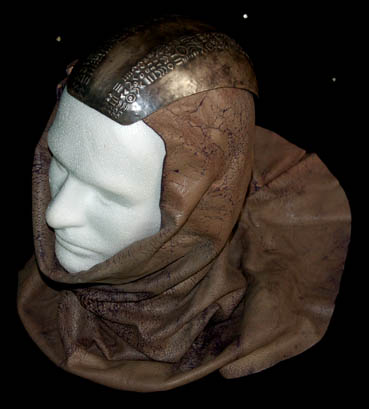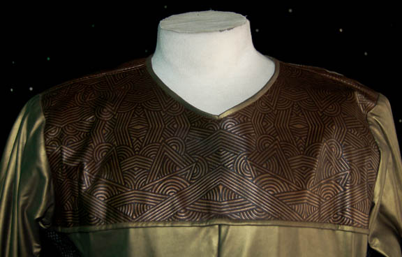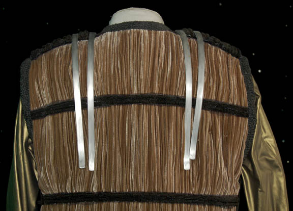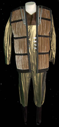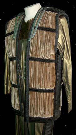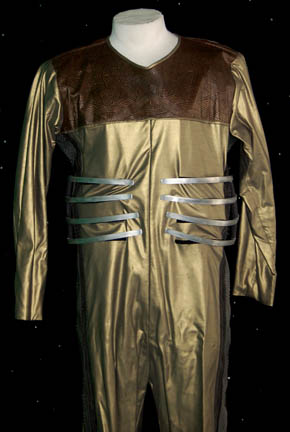 Description: The Son'a are a humanoid race decended from the Ba’ku who are known for their egotistical and materialist nature. They were featured prominently in the Star Trek IX: Insurrection feature where they were fighting a loosing battle to overcome the affects of aging without access to the regenerative effects of the Ba’ku planet’s metaphasic radiation. This uniform was worn by a Son’a Officer and includes a gold colored vinyl jumpsuit with patterned shoulders. Down each side are black strips of capillary rubber, the bottom of each leg has black elastic stirrups and there is a zip up the back. There are also four metal ribs that Velcro onto each side. The lined waistcoat is made of pleated velvet with black bubbled latex trim. Two metal ribs Velcro onto each shoulder denoting rank. The knee high black boots are padded with four metal rings around each calf. The rings have become loose with time and may need to be attached more securely. The gloves are black leather, cotton and bubbled latex with a latex hand control on the back of the left glove. The costume comes complete with a Son’a cowl and metal skull plate. Please note that at the time of this listing, this is the last Son'a costume available.