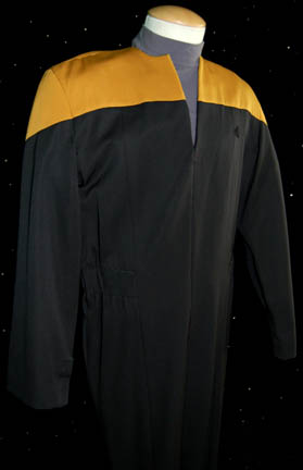 Description: A male Operations Gold Starfleet uniform made for wear during the Star Trek: Voyager series. The uniform is black with Operations gold shoulders, a small Velcro patch on the left breast for a Combadge (not included) to attach, a zip up the front and two pleats in the back. Around the waist are loops for away-team gear (not included) to attach. A gray long sleeved undershirt accompanies the jumpsuit. Costume comes complete with costume tag.