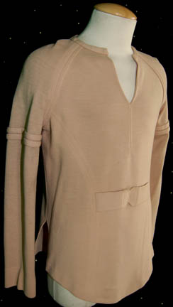 Description: A beige colored long sleeved Class-B Starfleet uniform shirt featured in Star Trek I: The Motion Picture. The shirt comes with these unattached elements: a medical green Epsilon IX assignment patch, a pair of green division strips, and a plastic bio-monitor. The shirt is intended for male wearers.