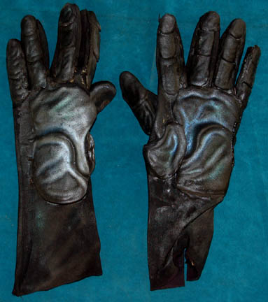Description: The Hirogens are a strong nomadic race of hunters featured in multiple Star Trek: Voyager episodes including “Message in a Bottle” and “Hunters”. A black full length cast rubber body suit painted with silver details to give it an armored appearance, with matching gloves, and boots. A secondary bonus pair of boots is also included. The right breast features a pair of green lights that are molded into the costume and activated by a battery box housed behind the left shoulder. It is hidden under the encasing back mold. It requires four AA batteries (not included) to operate the lights. This costume would have made appearances in episodes like “Flesh and Blood, Part I” and “Hunters”. Due to time, use and storage the costume has significant wear, most notably around the shoulders. Costume comes complete with costume tag.