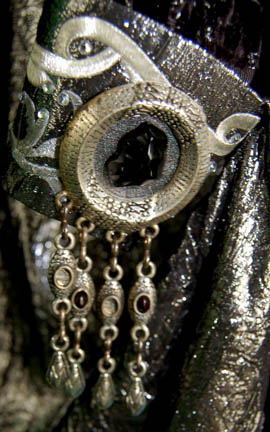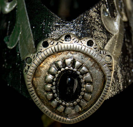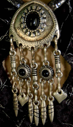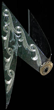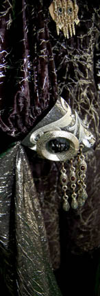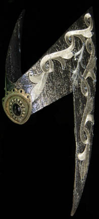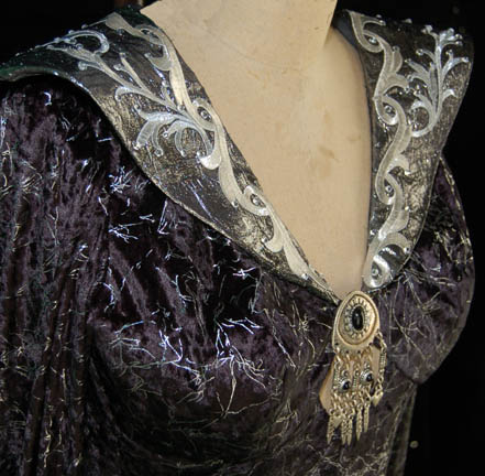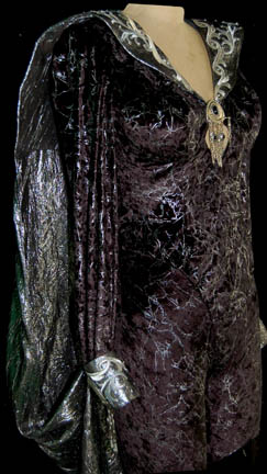 Description: “Demonica” (Heide Kramer) was a character in “Tom Paris'” (Robert Duncan McNeill) “The Adventures of Captain Proton” holodeck program featured in the Star Trek: Voyager episode “Thirty Days”. When off the holodeck, Demonica was “Megan Delaney”; a Starfleet crewman onboard the U.S.S. Voyager. The costume includes a black crushed velvet leotard with cracked silver detail. A metal decoration is attached to the center of the bust with metal tassels. A silver and black fabric cape snaps onto the leotard and has elaborate cuffs that snap around the wrists. Worn under the leotard are corresponding stretch trousers. The impressive knee high boots are black vinyl with a substantial heel and a zip up the side. A corresponding headdress with a metal accent on the front is also included. A second pair of boots with metal accents is also included. Costume comes complete with costume tag that reads, “Voyager, 202 Down Deep, Demonica, Heidi Kramer”. It lists the episode as “Down Deep” which was “Thirty Days” working title.