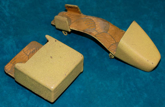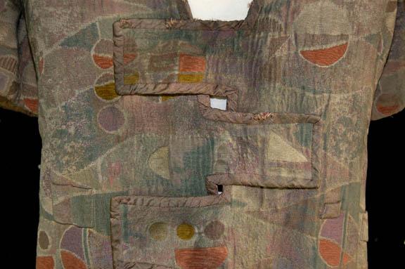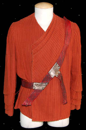 Description: A lot of items featured variously throughout Star Trek: Voyager episodic television. This lot is for wear by Ethan Phillips in the role of “Neelix” and consists of a long-sleeved, rust-colored, chenille shirt featuring textured stripes down the front and back, a pleated flap across the front that covers the buttons, several layered, false cuffs, a long-sleeved, raised, paisley-print shirt in a further rust motif with buttons down the front. Multi-colored vertically striped trousers with a fish scale design, a short-sleeved, beige jacket featuring an abstract pattern of shapes in different sizes and colors as was a running motif with garments for the character; flaps that connect across the stomach, a Velcro patch for a commbadge (not included), and is distressed for effect. Also included is a red harness featuring gold-colored accents with metal-colored rivets, a yellow painted tricorder and phaser holster that clip to a belt, and dark-pink leather boots. Several sewn in tags read ‘Voyager, Ethan Phillips' whereas the trousers denote reuse by a “George Colucci”, a known Trek stunt man.