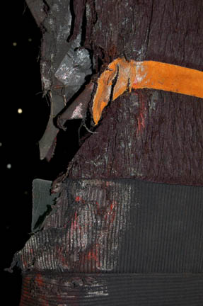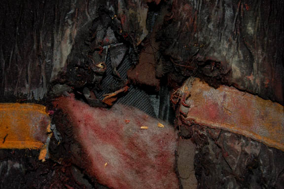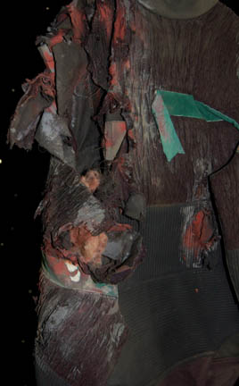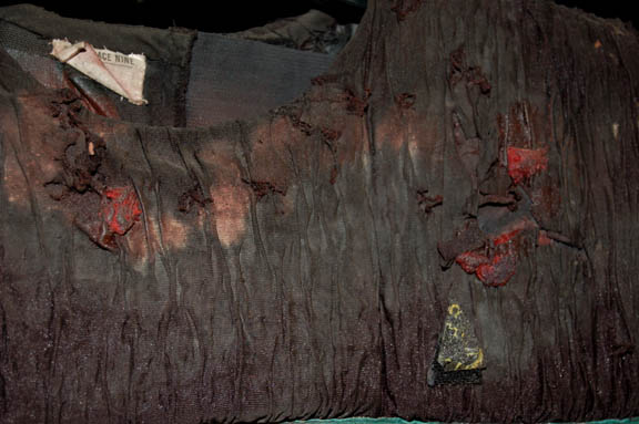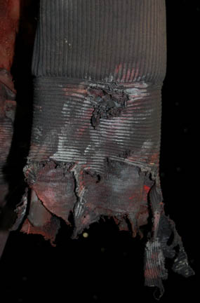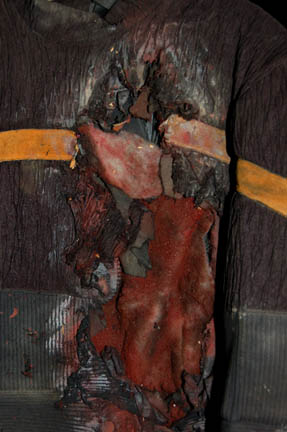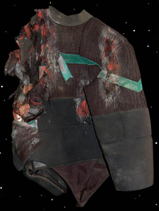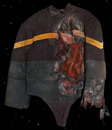 Description: A lot of costumes featured during the Dominion War where a harder, more durable uniform was required in episodes like “Nor the Battle to the Strong” or “The Siege of AR-558”. This lot consists of four similar long-sleeved, black jackets featuring a neoprene jumpsuit like material divided into sections with a black, textured fabric sewn on top of it, Operations Gold or Sciences Blue division strip across the front, the bottom half of the jacket being more heavily padded than the rest. The only thing that makes these garments less than identical is the degree of distress they are in to denote the virtual hopelessness of the situations put forth in the episodes; they range from just a few rips and tears and fake blood to an entire arm being gone. Only one garment has a sewn in tag, the rest just have names written in them, and it reads ‘Deep Space Nine, Bill Cramer ‘.