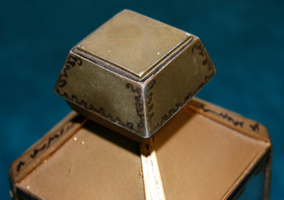 Description: A prop item featured in the Star Trek: Deep Space Nine episode “The Begotten”; wherein “Odo” (Rene Auberjonois) discovers an infant Changeling and attempts to instruct it to shapeshift in a more passive, friendly way than he was taught. This item is the container that the supposedly dead Changeling was being held in; it is a plastic container vaguely reminiscent of a lantern, featuring gold-colored housing with dark-colored accents, clear windows with their own accents, and a matching, corked lid on the top. The item measures approx. 4 X 4 X 9 inches.