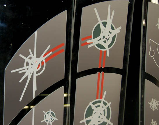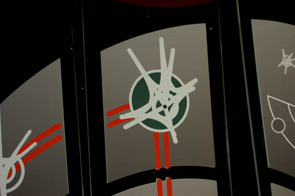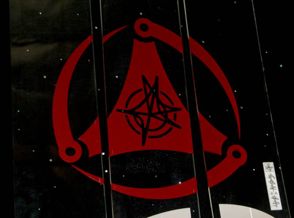 Description: A set of three Xindi-Arboreal panels featured in the Star Trek: Enterprise episode “The Shipment”. Appearing next to “Captain Arc her” (Scott Bakula) as he investigated the mining complex operated by “Gralic Dur” (John Cothran Jr.), the panels are large pieces of clear acrylic with expertly detailed Xindi iconographic applications and red silk-screening. The items are three panels that create a screen when placed next to one another, the emblem of the mining consortium is silk-screened at the top and the graphical applications are all presented lower and in sequence with one another as they fit. The items measure approx.