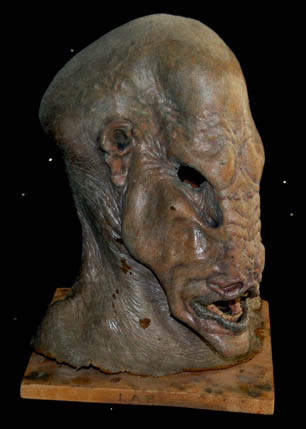 Description: An alien head made for use on a background alien that was featured during the Star Trek: Deep Space Nine series including the episode “Armageddon Game”. The detailed head is made of latex that is painted to give the appearance of flesh. The top of the head is furry to the touch and there are false teeth in the mouth. The mask is displayed on a wooden base. (Please note that the crew here at the Star Trek Auction are quite fond of this fellow who we named “Lancaster” so whoever wins him please take care of him!) Measures approx. 11 x 11 x 15 ½ inches.