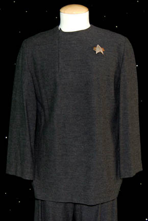 Description: A costume featured in the two-part, season 2/3, cliffhanger episode of Star Trek: Voyager “Basics: Part I & II”; wherein the Kazon –Nistrim successfully take over “Voyager” and strand the crew on a desolate, primitive planet. This costume is for wear by veteran character actor Brad Dourif in the role of the sociopathic Betazoid, “Lon Suder”, and is a long-sleeved, dark-gray tunic featuring a placket front button, Velcro patch for a distressed commbadge, and matching trousers. A sewn in tag reads ‘Voyager, Brad Dourif' but the costumer’s tag denotes original use in the Star Trek: The Next Generation episode “Frame of Mind” and was reused for the Voyager role.