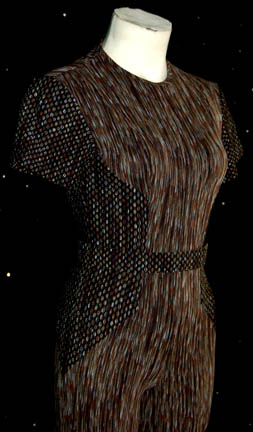 Description: A costume featured in the Star Trek: Deep Space Nine episode “Time's Orphan”, wherein “Molly O’Brien” (Hannah Hatae) falls through a portal three hundred years into the past and returns barely able to remember anything about her past. The costume is for wear by Michelle Krusiec in the role of the “Molly O’Brien” that had been stuck on that uninhabited planet for ten years and is a short-sleeved, full-length jumpsuit with vertical striping in various shades of brown and white, a textured design over the striped pattern along the arms, down the sides, and on the belt, a zip down the back, and stirrups for the feet. A sewn in tag reads ‘Deep Space Nine, Michelle Krusiec’ and the costumer’s tag reads ‘DS9 #548, Molly 18, Michelle Krusiec’.