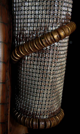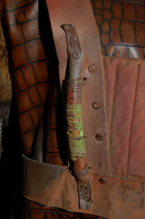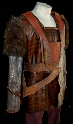 Description: A costume featured in various episodes of Star Trek: Enterprise, but most notably as the Klingon Chancellor in the pilot “Broken Bow”. The costume is long-sleeved coat made of a snakeskin-patterned leather on the front and smooth brown leather on the back, fur along the upper arms, metal colored link mail on the arms coiled copper colored accents around the collar, cuffs, and wrists, a brown belt and bandolier made of patchwork pieces of leather. Also included are a pair of brown, form-fitting, overall style trousers with stirrups for the feet. A sewn in tag reads Peter Henry Schroeder, the belt indicates wear by multiple actors, and the costumer's tag reads ‘Enterprise, Klingon, Peter Henry Schroeder’.