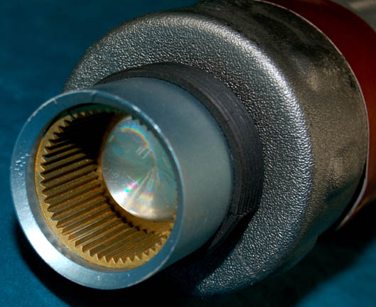 Description: A phaser array power cell from the U.S.S. Defiant and featured in the Star Trek: Deep Space Nine episode “Behind the Lines”. It is in the same style as the one used in a ritual by “Captain Sisko” (Avery Brooks) in which he took hold of a discharged power cell, gave a small speech and everyone applauded in recognition of its accomplishments in battle. Made of plastic painted silver, the cell has resin components and gold colored metal rods on each side. Measures approx. 29 x 6 ½ x 4 inches.