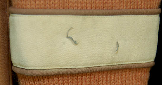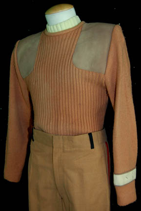 Description: A costume featured in Star Trek V: The Final Frontier for wear by Leonard Nimoy and Greg Barnett as “Spock”. The costume is caramel colored wool trousers with red division stripes down the outside seams of the legs and a pair of white elastic bands in the spine of the waist, a matching wool sweater with multiple white Velcro placements for the attachment of a stunt harness and two corresponding holes for interior riggings, and a command division white uniform undershirt, sleeveless, with a ribbed collar. The trousers feature a sewn on Paramount tag reading ‘Regular Nimoy', the undershirt features a sewn in Paramount tag reading ‘Leonard Nimoy’, and the sweater features a sewn in tag reading ‘Barnett’ with a scratched out name. Remaining ‘dust’ is present on the shoulders of the sweater from production use and the left sleeve features a command white division strip and remaining threads from a removed badge. Three costumer’s tags are present reading: ‘Greg Barnett, Dbl Spock, for fiberglass flying rig’, ‘Barnett, side pic, aged (st. dbl Spock)’, and ‘Barnett, side pick’.