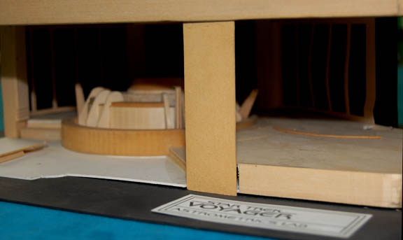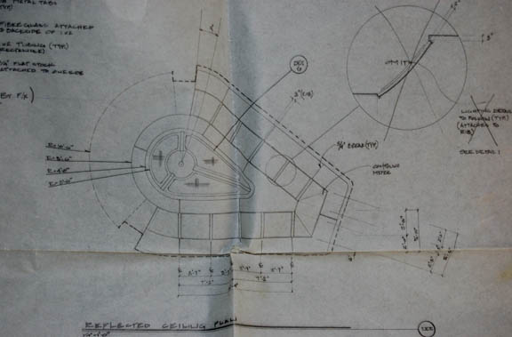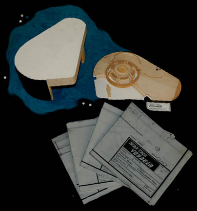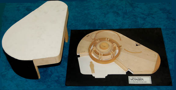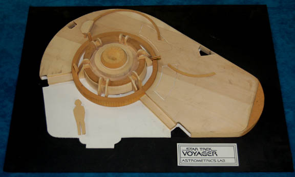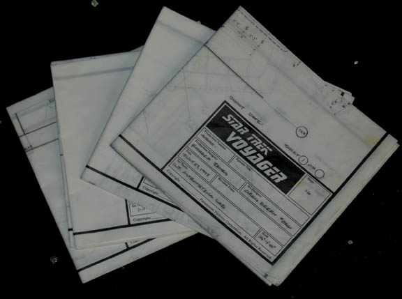 Description: A lot of items involved in the construction of the Astrometrics Lab set featured in Star Trek: Voyager. This lot consists of a wooden, unpainted, model complete with a model of the roof and the primary monitor, a little model person to give the proper scale; a set of five blueprints featuring various views and scales of different aspects of the Astrometrics Lab interior. Blueprints feature such information as show name, production number, production designer, date, scale, and set name; some also feature episode name. The model measures approx. 20 X 15 X 2 inches.