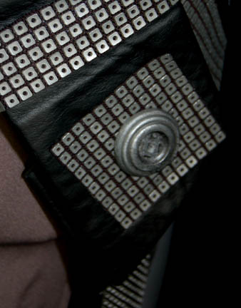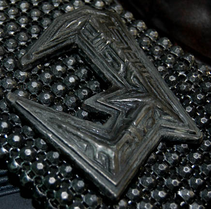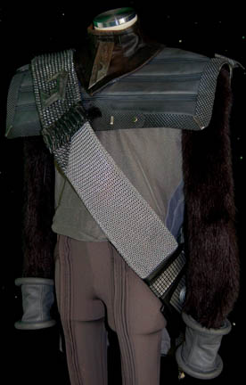 Description: A lot of Klingon costume aspects similar to those featured throughout all three 24th century Star Trek series and Star Trek V: The Final Frontier. This lot of female Klingon warrior costume aspects consists of gray trousers that have pleats down the front and back and around the sides, stirrups at the feet, and are for wear by Spice Williams in the role of “Vixis” in “The Final Frontier”; an unfinished, gray, vinyl quilted tunic with an unattached arm and two extra arms that are quilted. A gray, pleated, sleeveless undershirt, gray, fiberglass chest piece, a baldric sash, for wear by Marlene Sosebee in the DS9 episode “Tacking into the Wind”, featuring studded “metal” tabs and “chainmail” with Klingon house glyph; a dark-gray, quilted vinyl coat, for wear by Cathy Demor in an uncredited role on DS9, with matching shoulder armor, textured, diamond-shaped accents and black, faux-fur sleeves. Included is a pair of the black gloves with half the fingers cut off, a matching belt, and choker with a unique, metal house insignia; a pair of gauntlets and gloves for wear by Sandra Nelson in the role of “Tavana” on DS9, two, black leather chokers with symbols of different Klingon house on them, and two gray, vinyl gauntlets for wear by Thelma Lee in the role of “Kahlest” on the TNG episode “The Sins of the Father”. Sewn in or otherwise labeled tags are as listed.
