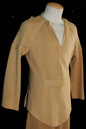 Description: A tan colored Class-B Starfleet uniform featured in Star Trek I: The Motion Picture. The item is tan trousers with a matching tan long sleeved uniform top and comes with these unattached elements: a bio-monitor, a pair of medical division-rank strips with gold thread triangle embellishments indicating the wearer to be a ‘petty officer', and a green backed Starfleet emblem patch for the left breast. The costume is intended for male wearers.