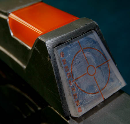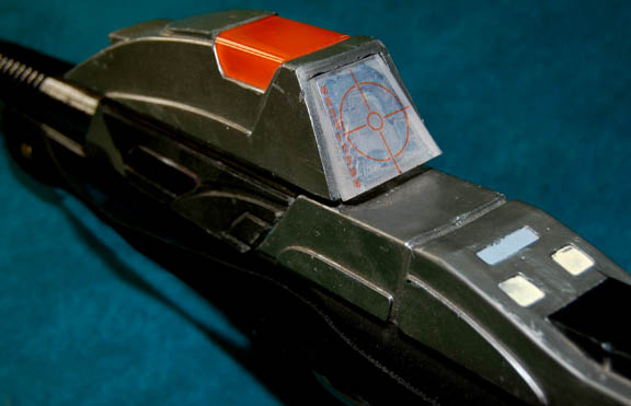 Description: This item is a Starfleet Type 3 Mark 3 phaser rifle constructed in a rubber so solid it seems like resin, silver-colored to resemble metal with painted black accents. Colored acrylic components have been added to create a faux power indicator light, a faux scope, a clear, acrylic, crosshair on the back of the scope, an attached stock, and an attached non-retractable, black, nylon strap. The item measures approx. 33 ½ x 9 ½ x 2 ¾ inches.
